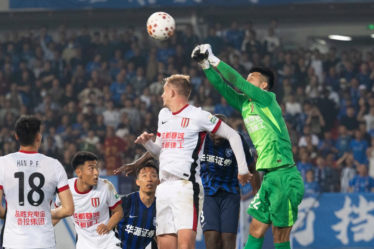 4月17日,成都蓉城队守门员刘殿座(右一)在比赛中扑救。新华社记者 肖艺九 摄