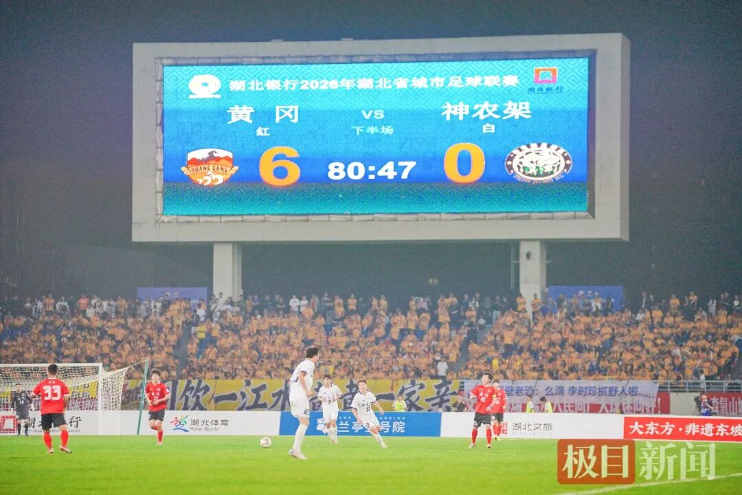 4月18日19时35分,2026年湖北省城市足球联赛(简称“楚超”)第一轮比赛打响。黄冈队在主场6比0大胜神农架队,这也是楚超开赛以来的最大比分。