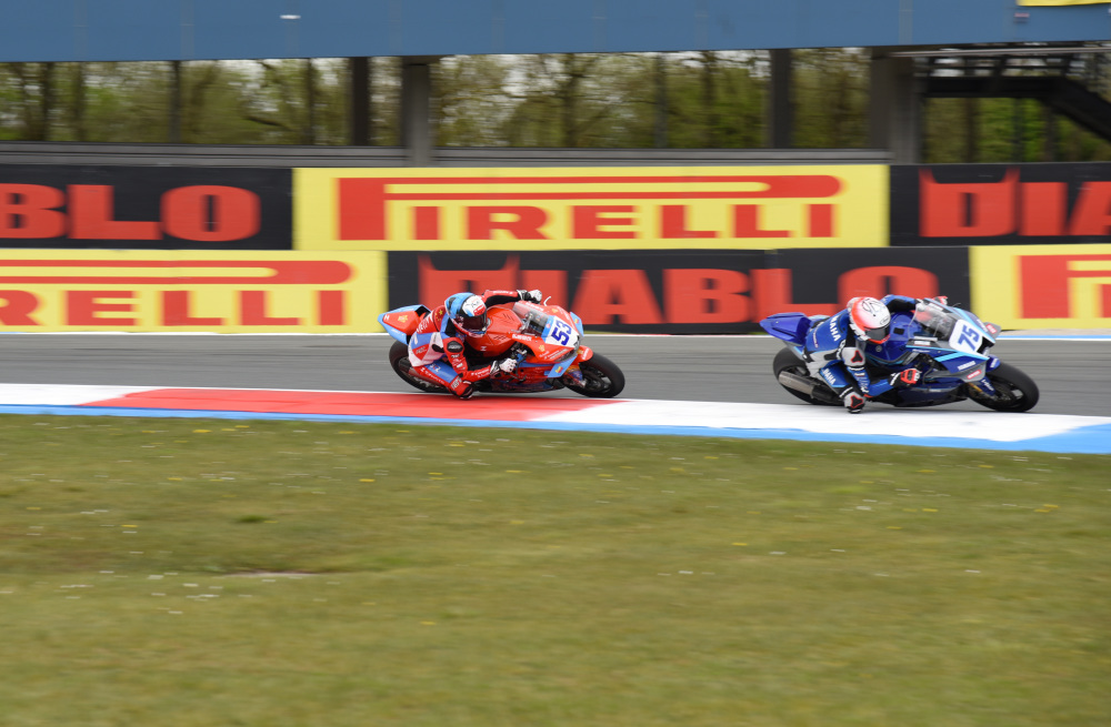 4月19日,“张雪机车”车队法国车手瓦伦丁·德比斯(左)在比赛中。新华社记者 邵海军 摄