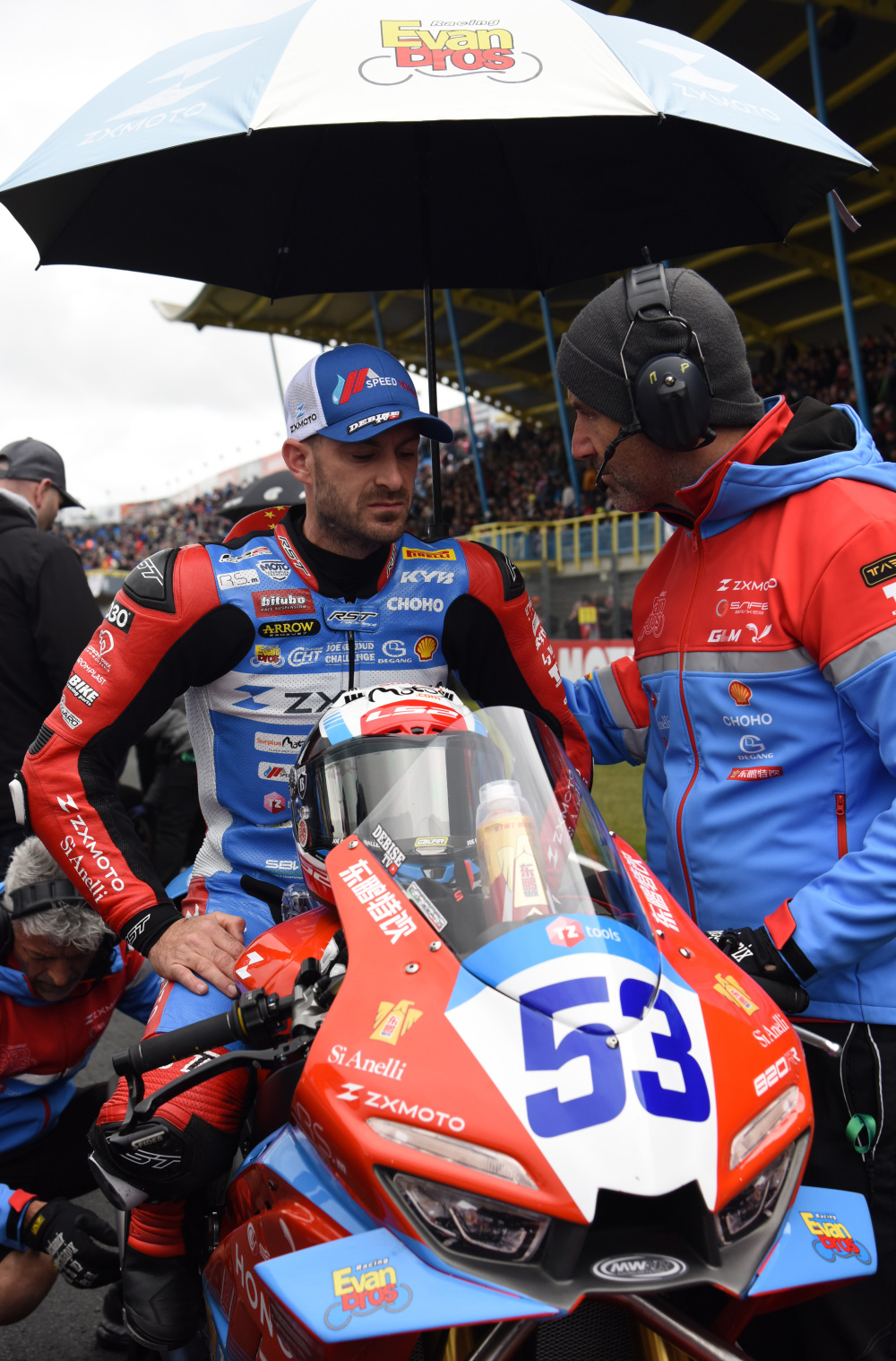 4月19日,“张雪机车”车队法国车手瓦伦丁·德比斯在比赛前与车队工作人员交谈。新华社记者 邵海军 摄