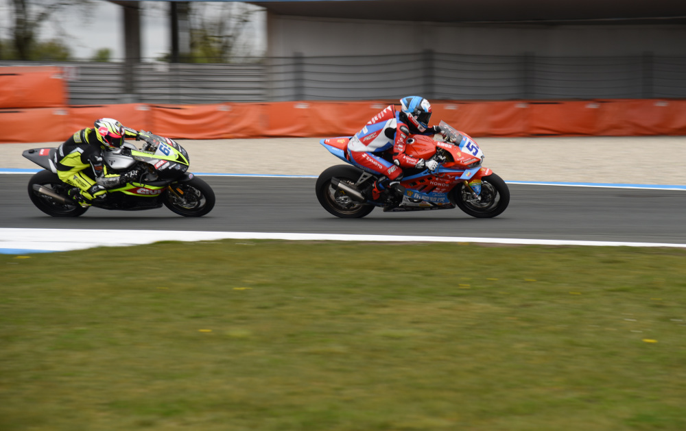 4月19日,“张雪机车”车队法国车手瓦伦丁·德比斯(右)在比赛中。新华社记者 邵海军 摄