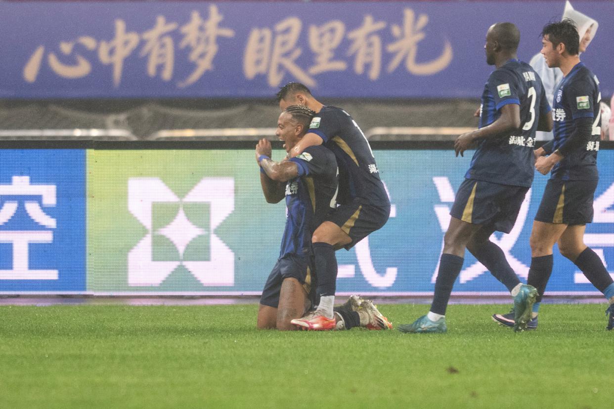 4月21日,武汉三镇队球员卡迪斯(左一)在进球后与队友庆祝。新华社记者 肖艺九 摄