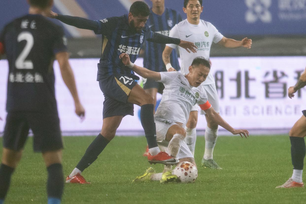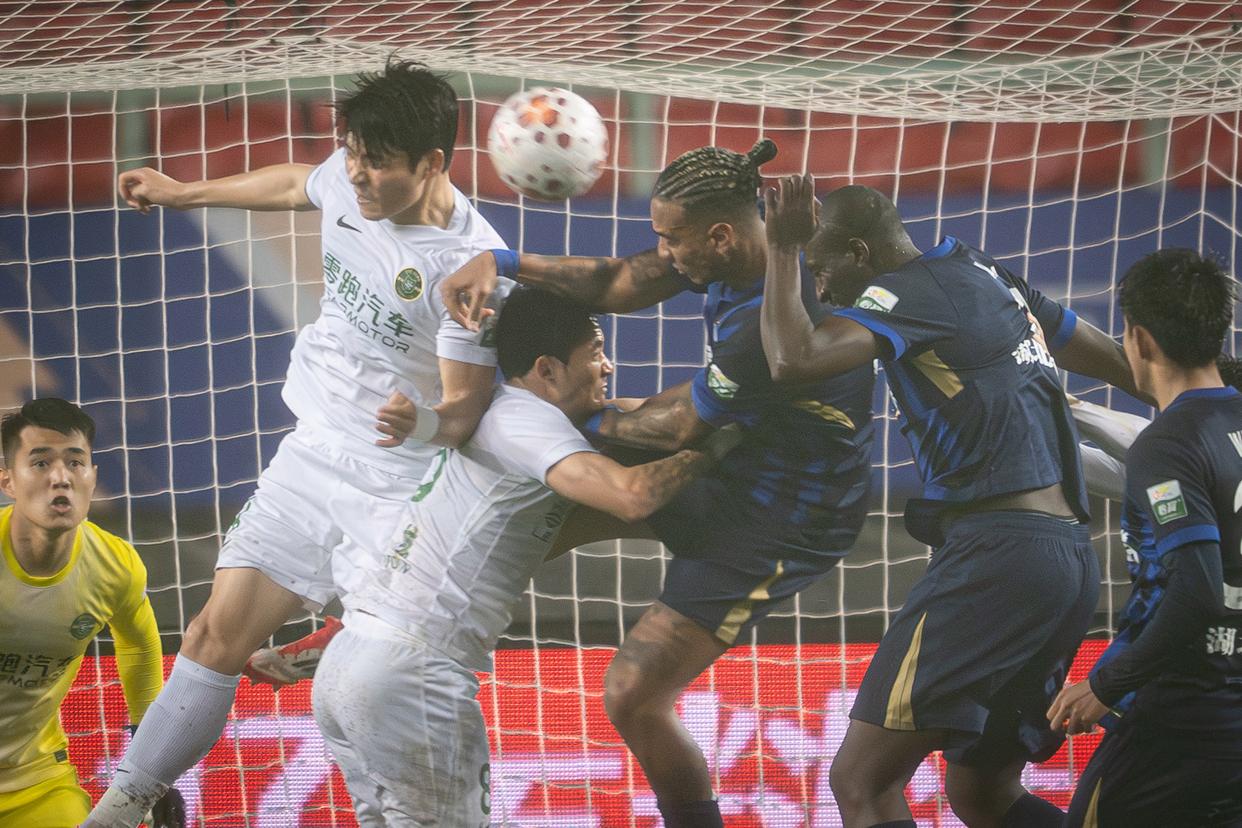 4月21日,武汉三镇队球员卡迪斯(右三)在比赛中争顶。新华社记者 肖艺九 摄