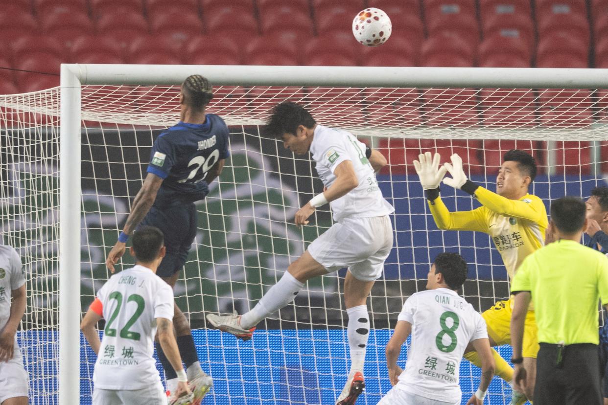 4月21日,武汉三镇队球员卡迪斯(左上)在比赛中争顶。 新华社记者 肖艺九 摄