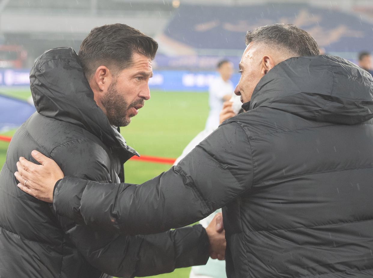 4月21日,浙江俱乐部绿城队主教练罗斯(左)在比赛前与武汉三镇队主教练本杰明握手致意。 新华社记者 肖艺九 摄