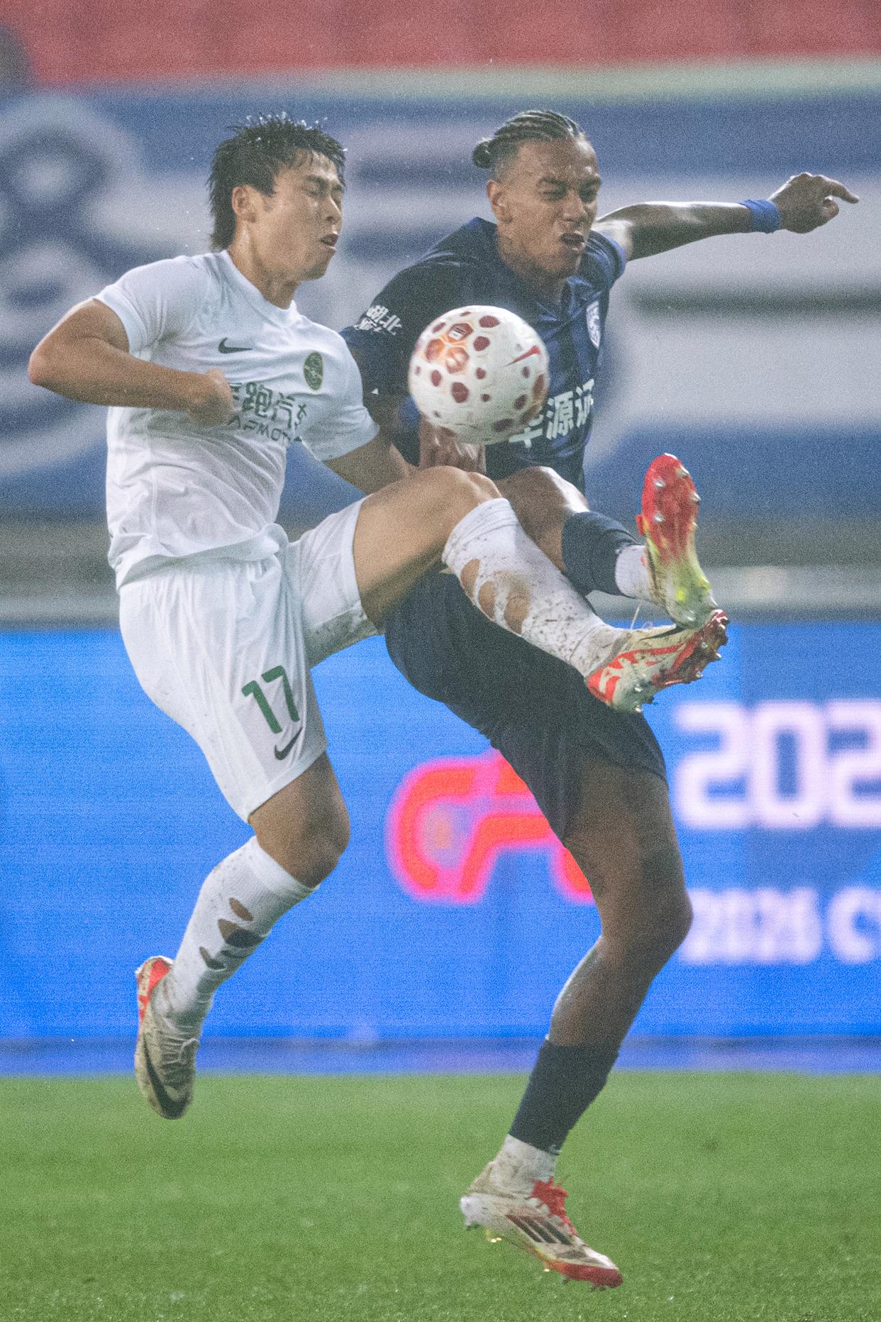 4月21日,武汉三镇队球员卡迪斯(右)在比赛中与浙江俱乐部绿城队球员汪士钦拼抢。新华社记者 肖艺九 摄