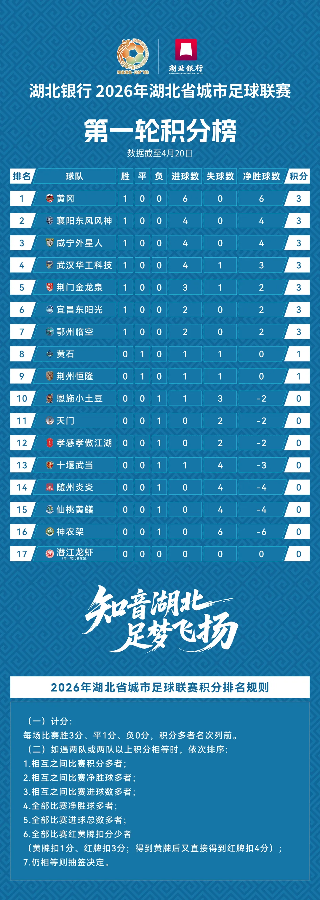 “楚超”第一轮积分榜,天门队与孝感孝傲江湖队位次相邻。(来源:湖北省城市足球联赛)
