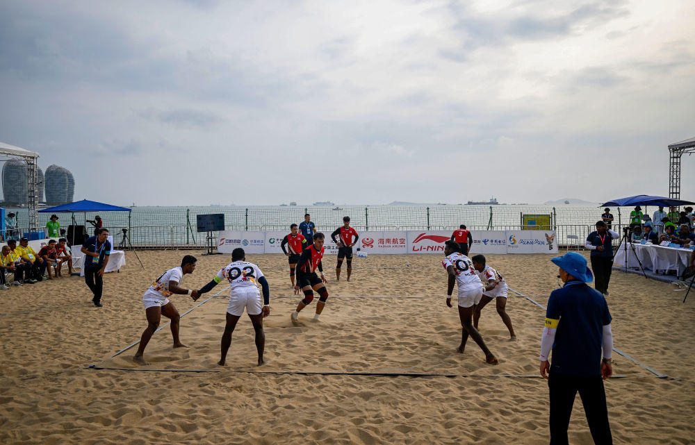 4月23日,斯里兰卡队和泰国队在沙滩卡巴迪男子小组赛中。新华社记者赵子硕摄