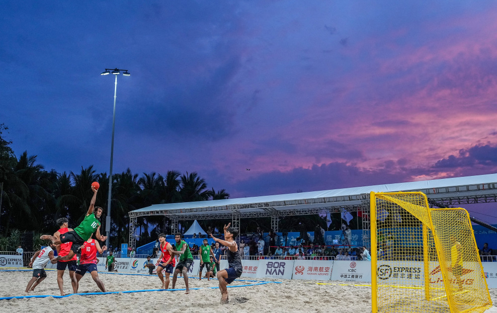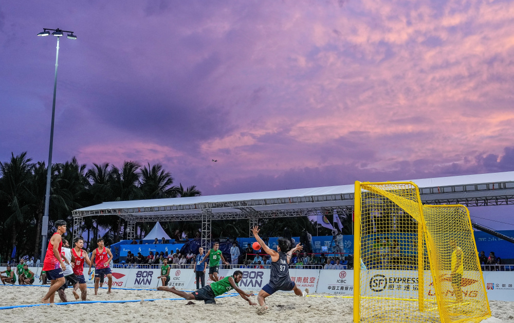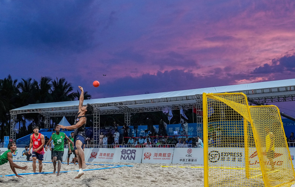 4月24日,在海南三亚举行的第六届亚洲沙滩运动会沙滩手球男子小组赛中,泰国队2比0战胜马尔代夫队。