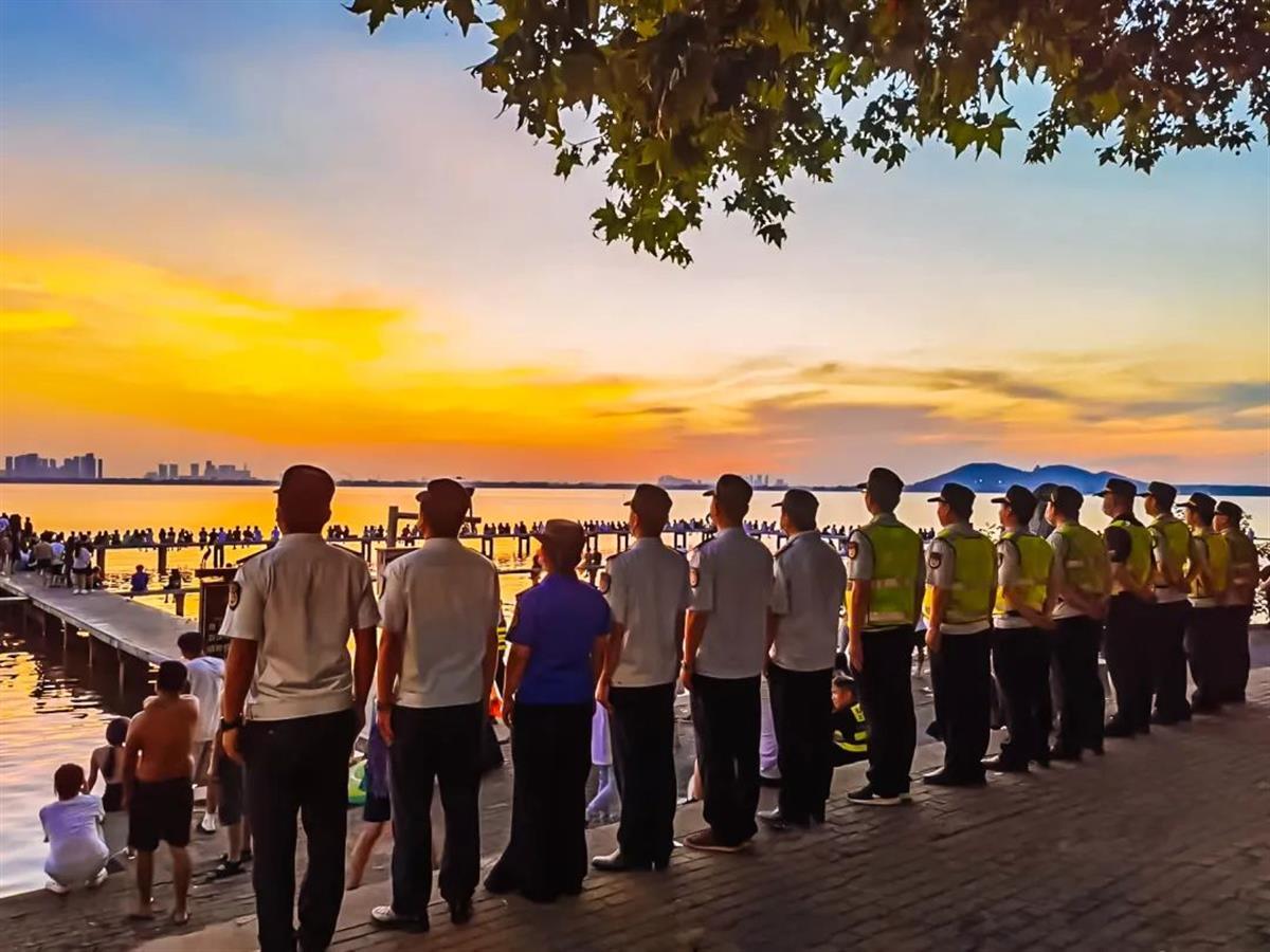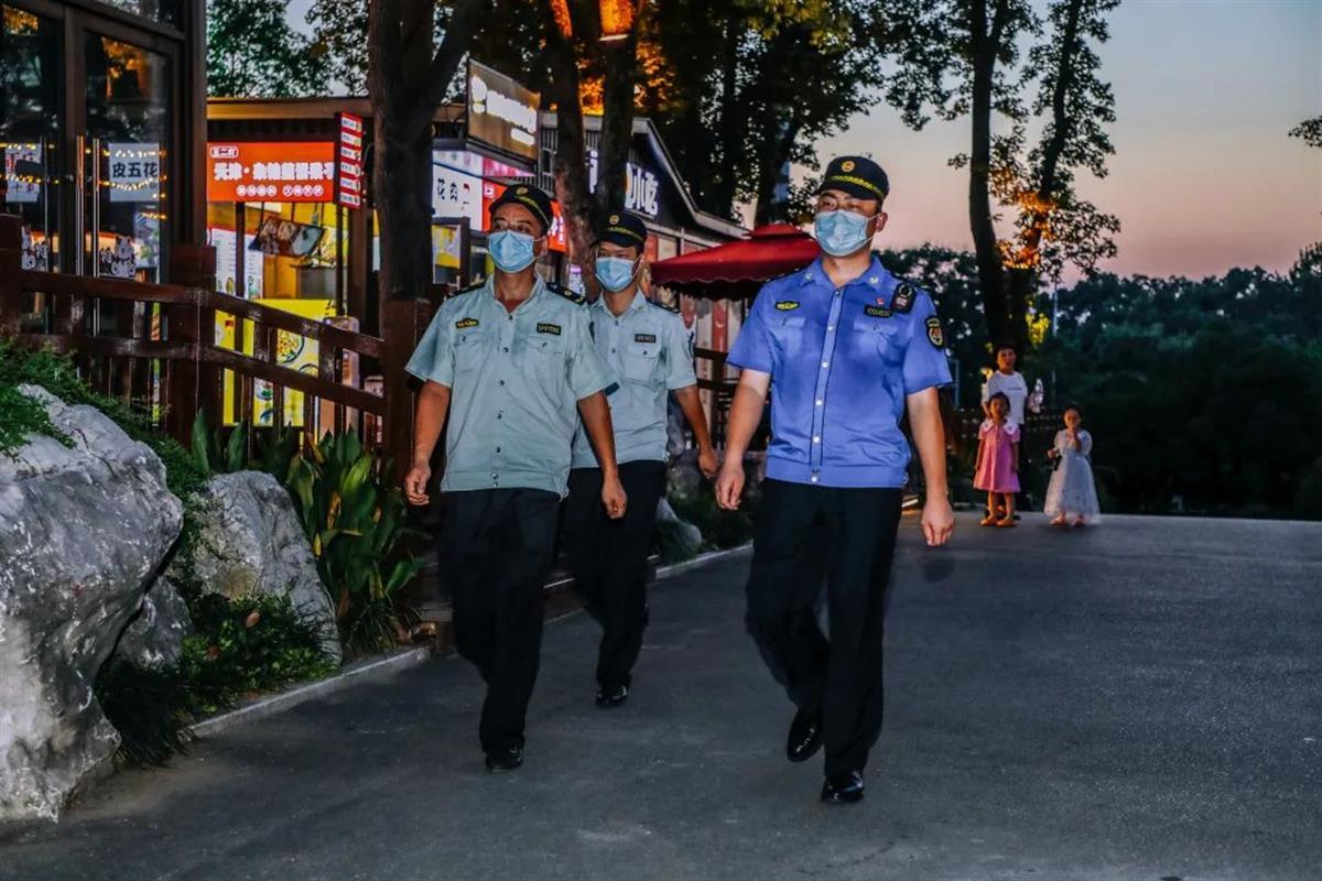 不仅是城管工作细致,整个“东湖夜游”文明有序,靠的是多部门联动保障:东湖风景区公安分局制定详细安保工作方案,实时根据景区人、车流量,分级动态调整勤务模式,设置固定岗、巡逻岗、武装备勤点,确保景区平安;交警大队根据周边车流和拥堵情况,及时采取道路交通管控和调流措施;区文旅局及时发布动态客流数据及活动信息,协调景区策划丰富文旅活动等。