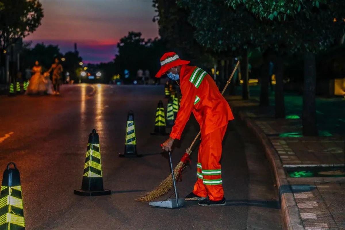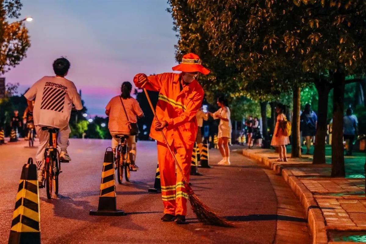 “夜游期间,人流车流骤增,原本可以机械化运作的道路保洁工作,不得不改为人工作业。为了保持环境整洁,环卫工都是徒手装袋。”磨山片区清扫保洁负责人介绍,“我们在景区进出沿路,每隔200米设置一位保洁员,来回巡逻式清扫,确保垃圾落地5分钟内被拾起。并增加垃圾清运车频次,不间断清理景区垃圾箱。”