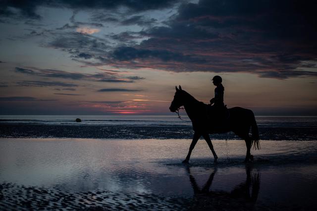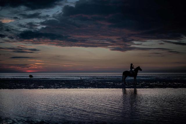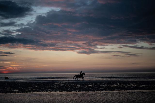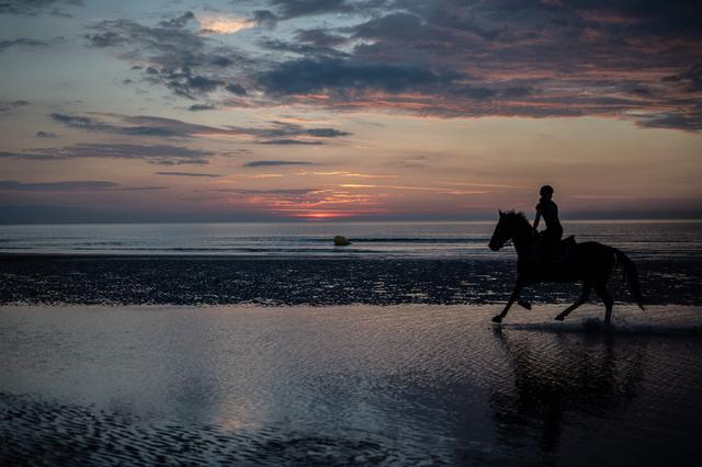 9月2日,在法国多维尔,一名女子在日落时分的海边骑马。 新华社/法新
