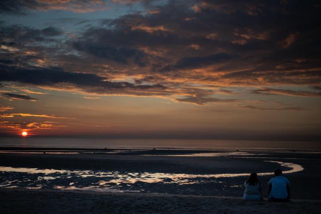 9月2日,人们在法国多维尔海边观赏日落。新华社/法新