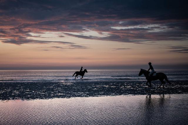 9月2日,在法国多维尔,两名女子在日落时分的海边骑马。 新华社/法新