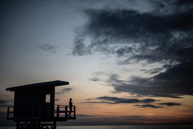 9月2日,一名女子在法国多维尔海边的救生员瞭望塔上远眺。新华社/法新