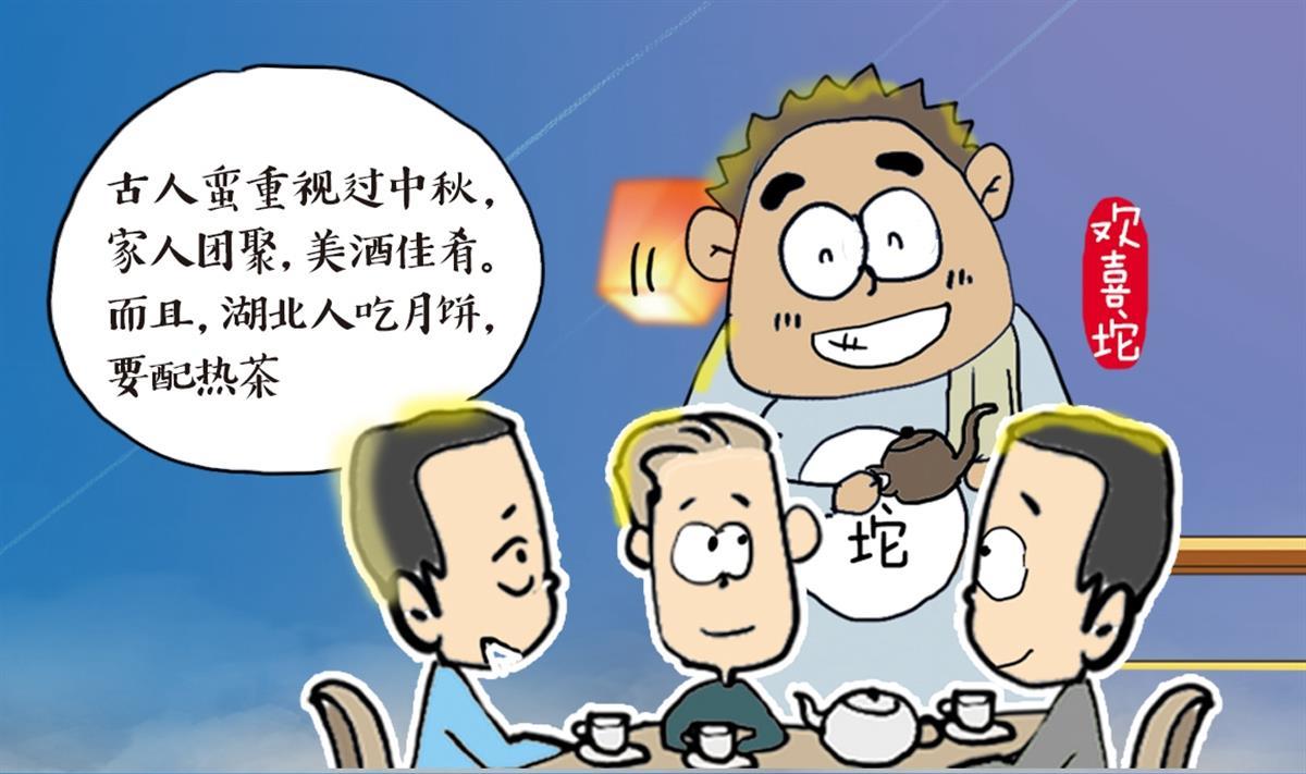 咵爹爹:吃滴当然少不了唦。中秋节是么事节?团圆的节唦。湖北人蛮重视中秋节,家家户户提前准备,过节这天,家人团聚,美酒佳肴。桌子放到屋子外头,月饼、糕点、水果……一边赏月一边吃。而且,湖北人吃月饼,要配热茶。