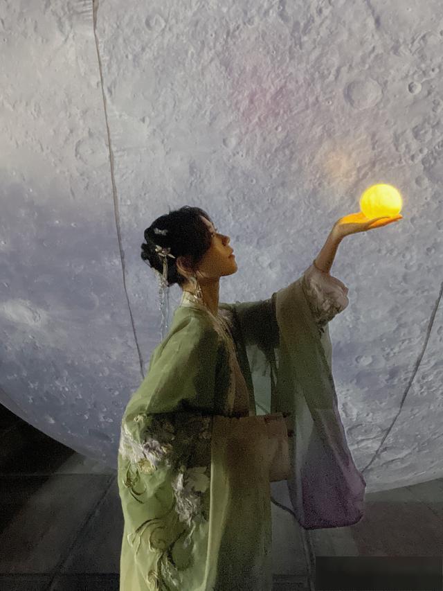 大学教师雷媛身穿一袭清雅的宋制汉服,手持月亮花灯在观景台徜徉,不时有人邀她一起合影。