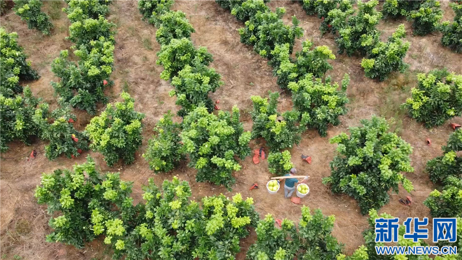 果农在果园内采摘运输柚子。新华网发蒙在旺摄