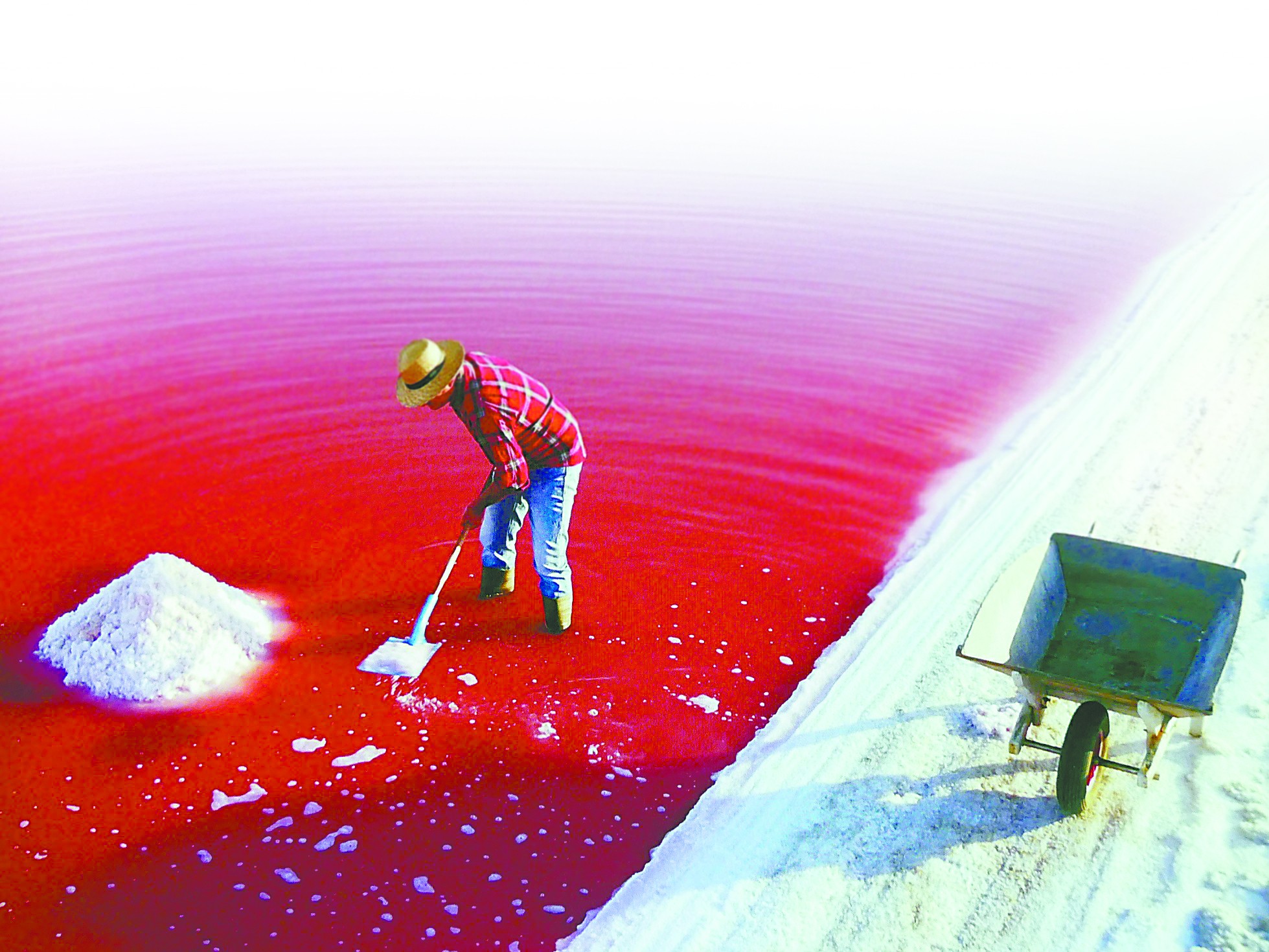 死水地区的产盐程序由大片的梯级盐湖逐步实现,海水经由五级盐池分级蒸发。在含盐度最高的结晶池,喜盐的杜氏藻为了生存释放出一种胡萝卜素,其独有的色泽将海水染成了奇异的粉红。盐湖于是经海藻“美颜”变成了一个玫瑰色的池子,绮丽而浪漫!在无风的天气里,飘着云朵的碧蓝天空、宏伟的死水城墙还有盐场晶莹雪白的盐山倒映在粉色水中,形成一面缤纷的 “天空之镜”,景致唯美至极。