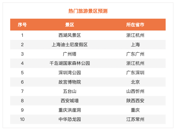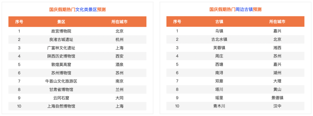 同时,国庆假期文化打卡、周边赏秋、户外运动等游玩方式得到了较多的关注。报告预测国庆假期文化类景点热门榜前三是北京的故宫博物院、杭州的良渚古城遗址和上海的广富林文化遗址。而江浙地区古镇旅游资源丰富,预测将占据国庆全国热门古镇前十中的四席,是上海等地市民周边游的热门目的地。