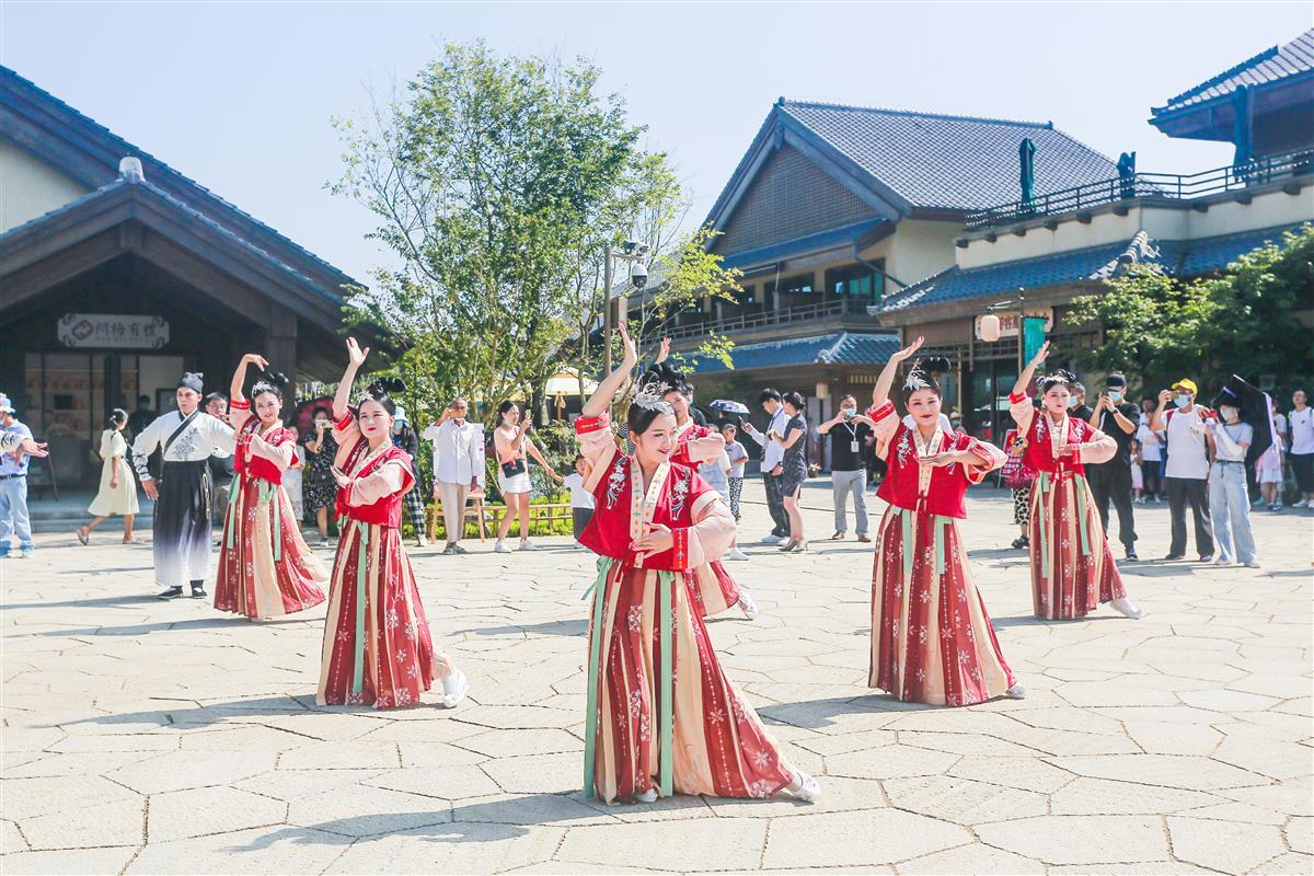 抬眼可见青山,脚下流水潺潺。记者漫步问梅村,绿植、流水随处可见,映衬着东方雅致的建筑,配合轻柔婉转的乐曲,让人情不自禁沉浸在这东方风韵之中。虽然气温较高,但游客们丝毫不减兴致,着汉服、贴花钿、撑纸伞、逛市集,随手一拍就是风景大片。