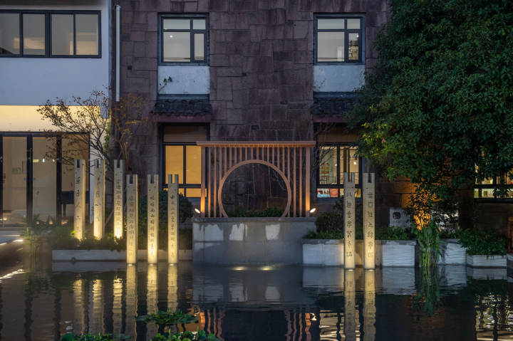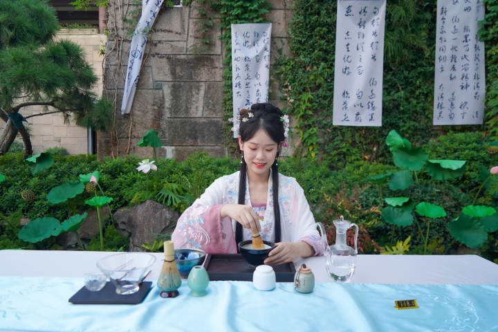 而金溪山庄露天庭院右侧,手作老师正在现场展示点茶技艺:一次注汤:燲(xié)盏,提高茶盏温度;二次注汤:量茶受汤,调如融胶;三次注汤:运筅击拂,白乳浮盏。一整套流程如行云流水,重现宋韵风雅。在手作老师表演点茶的同时,左侧还有身着宋制服饰的小姐姐抚琴,伴随着琴声,游客可坐在庭院里品宋韵菜肴、江南美食:清甜与香脆并存的桂花糖藕拼脆皮鸡、正当季的桂花酒蒸湖蟹……让人食指大动。近年来,金溪山庄餐饮品牌“金溪别业”研制宋韵菜肴,挖掘浙系食材,在在杭州市餐饮业“六名工程”评选中,荣获“名店”称号。