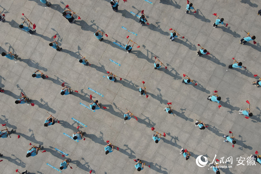 无人机视角下,学生们齐跳莲湘操。人民网王晓飞摄