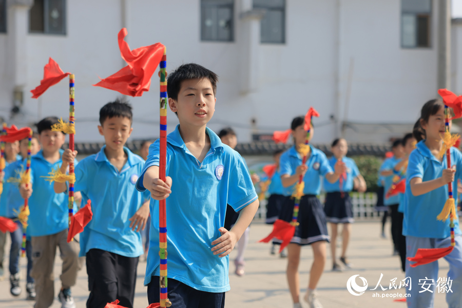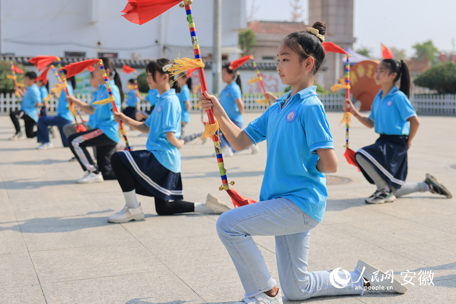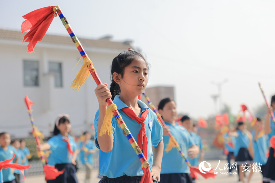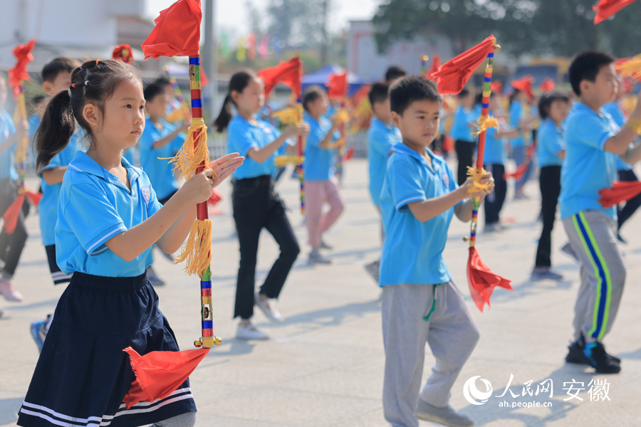 舞起莲湘棍,迈出整齐步伐,敲出悦耳韵律……近日,在安徽省合肥市肥西县柿树岗乡乡中心学校,300多名学生课间时间齐做莲湘操《我是幸福莲湘娃》,场面蔚为壮观。