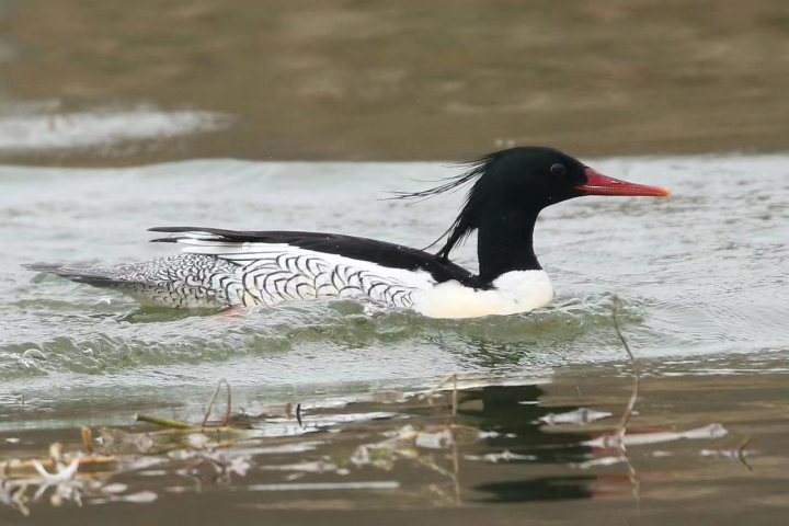中华秋沙鸭是鸭科秋沙鸭属的鸟类,与其他秋沙鸭相比,辨认它们有几个显著特征是:中华秋沙鸭枕部有长羽冠,前身材和下体白色,两胁有黑色鳞状斑。