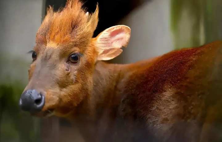 黑麂是一种体色较深的鹿类,鹿科麂类动物中体型较大的种类,头顶部和两角之间有簇状棕色冠毛,是中国特有种,国家一级保护动物,仅分布于浙江以及与浙江相邻的安徽、江西、福建的部分山区,数量极为稀少。