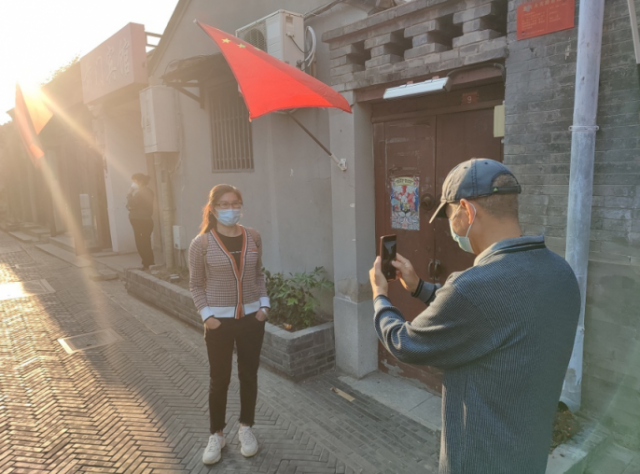 “这里不错,就这儿拍吧!”胡同西口,黎女士找了个角度,让爱人帮忙拍照,还特意嘱咐要拍上国旗。一问才知,她工作的单位正在举办喜迎二十大摄影展,这几天外出游玩,黎女士总要拍下不少照片。