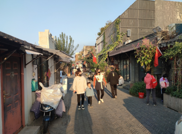 富有历史文化的胡同,在国庆期间成为了热门游览地。下午四点,大栅栏杨梅竹斜街里游人来来往往。胡同两侧挂着的国旗,增添了不少节日的气氛。