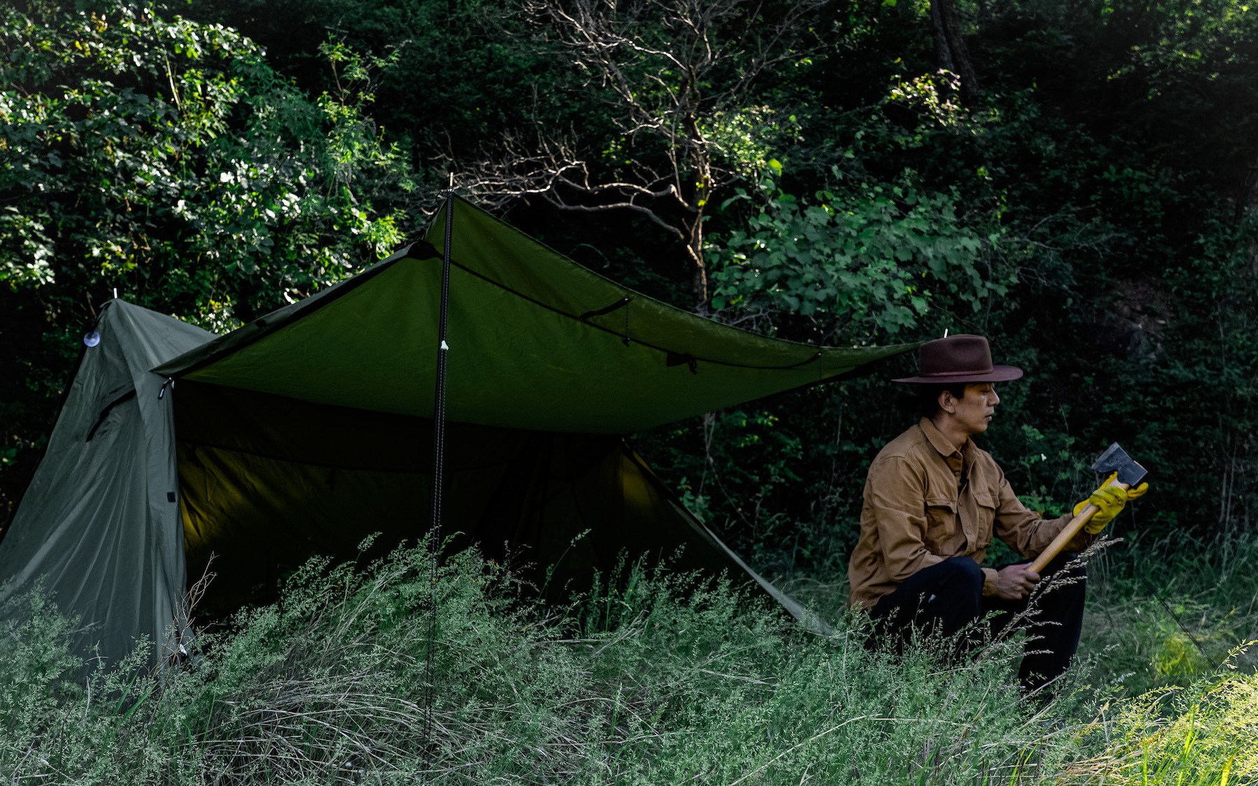 精致露营的核心是舒适好看,最常见的场景是坐在天幕下喝咖啡、聊天、拍照,很放松,但我会觉得有点无聊。与之相反,BC露营的场景是坐在丛林里劈柴、打绳结。它是露营的极简派,几百块钱就能搞定所有装备——我通常带着一块3×3米或者4×4米的遮雨布、一双牛皮手套、一把刀、一把锯、一把斧头、几根绳子、一个头灯,如果是在可以点火的地方,就带上镁棒、打火石或钻木取火工具。不需要上万元的帐篷,到野外找几根干枯的树枝,把雨布支起来,用绳子固定在树上就行了。我个人更喜欢BC露营,因为可以独自在野外住两天,心无旁骛,与自然融合。