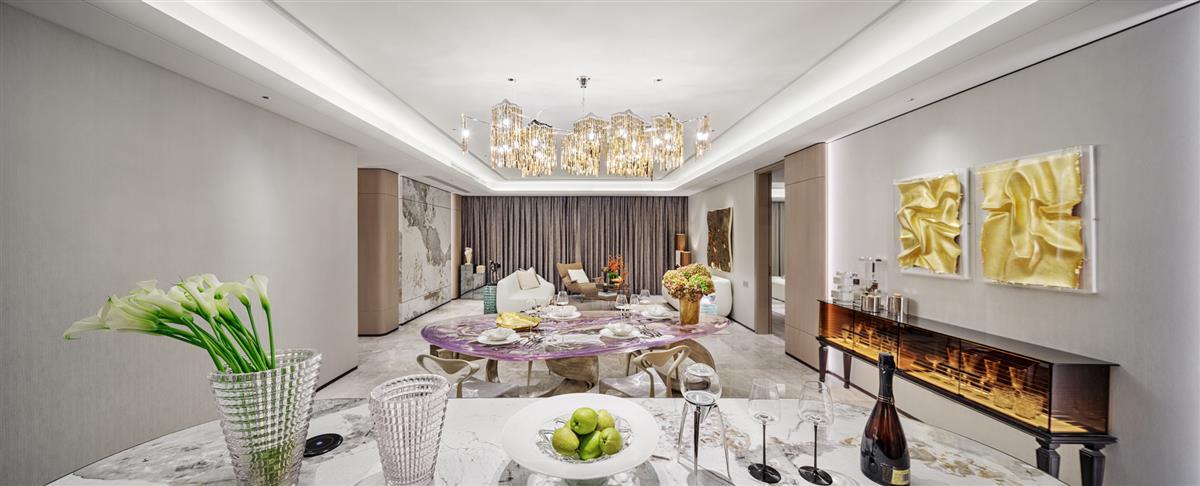 在室内设计方面,云廷三期以非凡尺度打造匹配塔尖的奢阔之享,整体设计以长江为灵感铺设展开,通透的尊贵质感,流动的线条美学,灵动的弧形元素,展示长江豪迈气度之余,演绎着高端圈层对国际化时尚生活的所有想象。