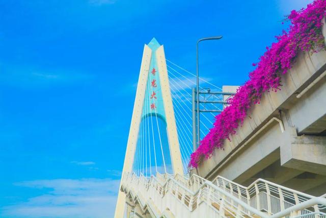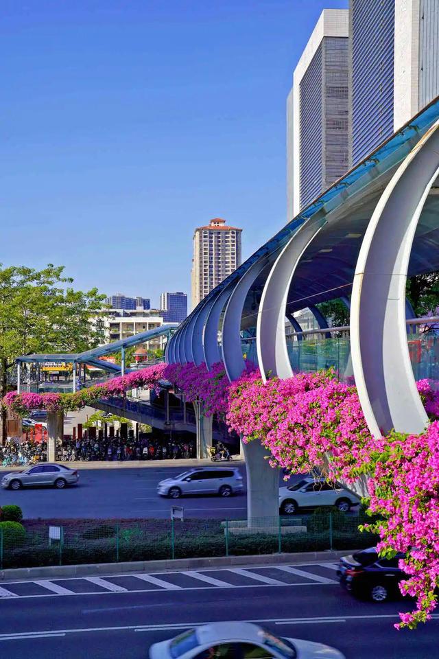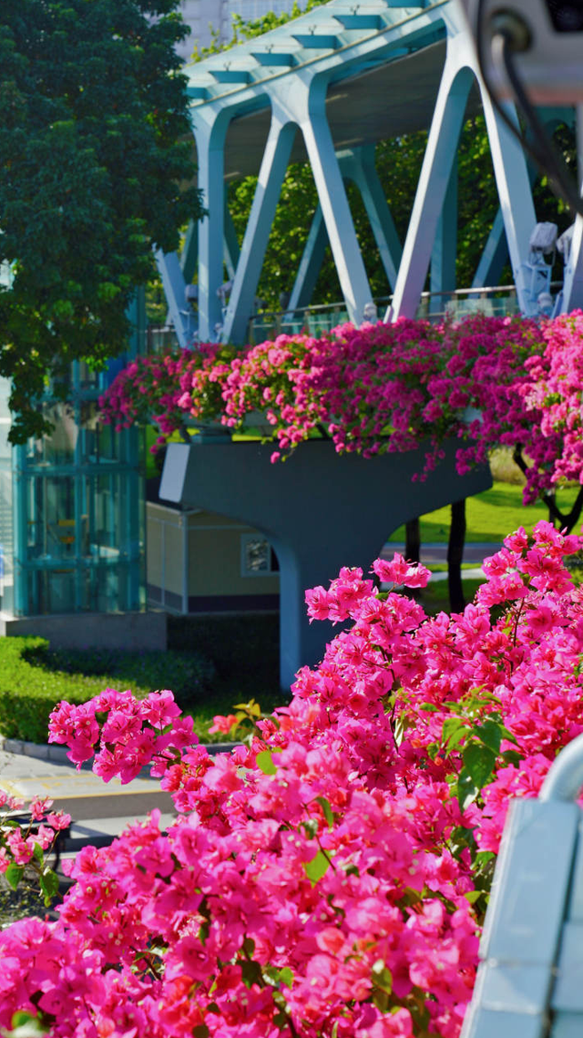 簕杜鹃的花语是“热情”,象征着坚韧不拔的品格。这个初秋,朵朵簕杜鹃在天桥上互相争艳,把佛山装点得活力又浪漫。