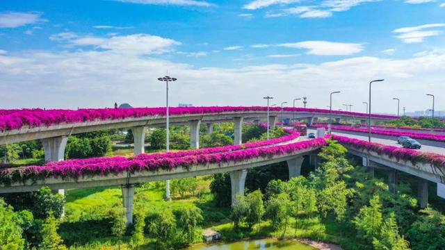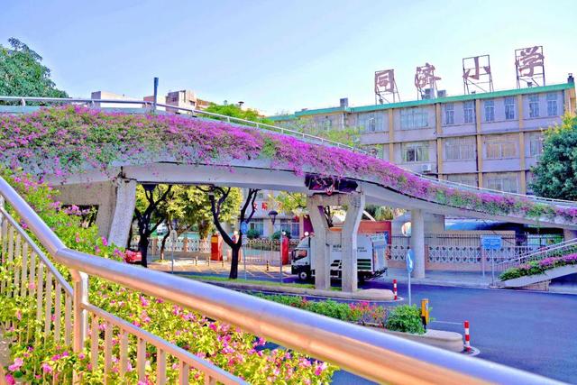 文华-亚艺天桥,大片的簕杜鹃间透露出点点绿茵。图/禅城城管