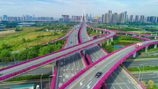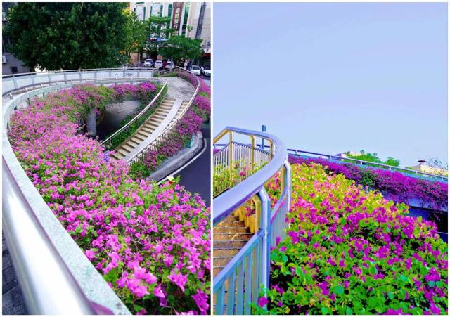 粉红的、玫红的、紫红的……车水马龙中,簕杜鹃如“花瀑布”般倾泻而下,格外璀璨夺目。