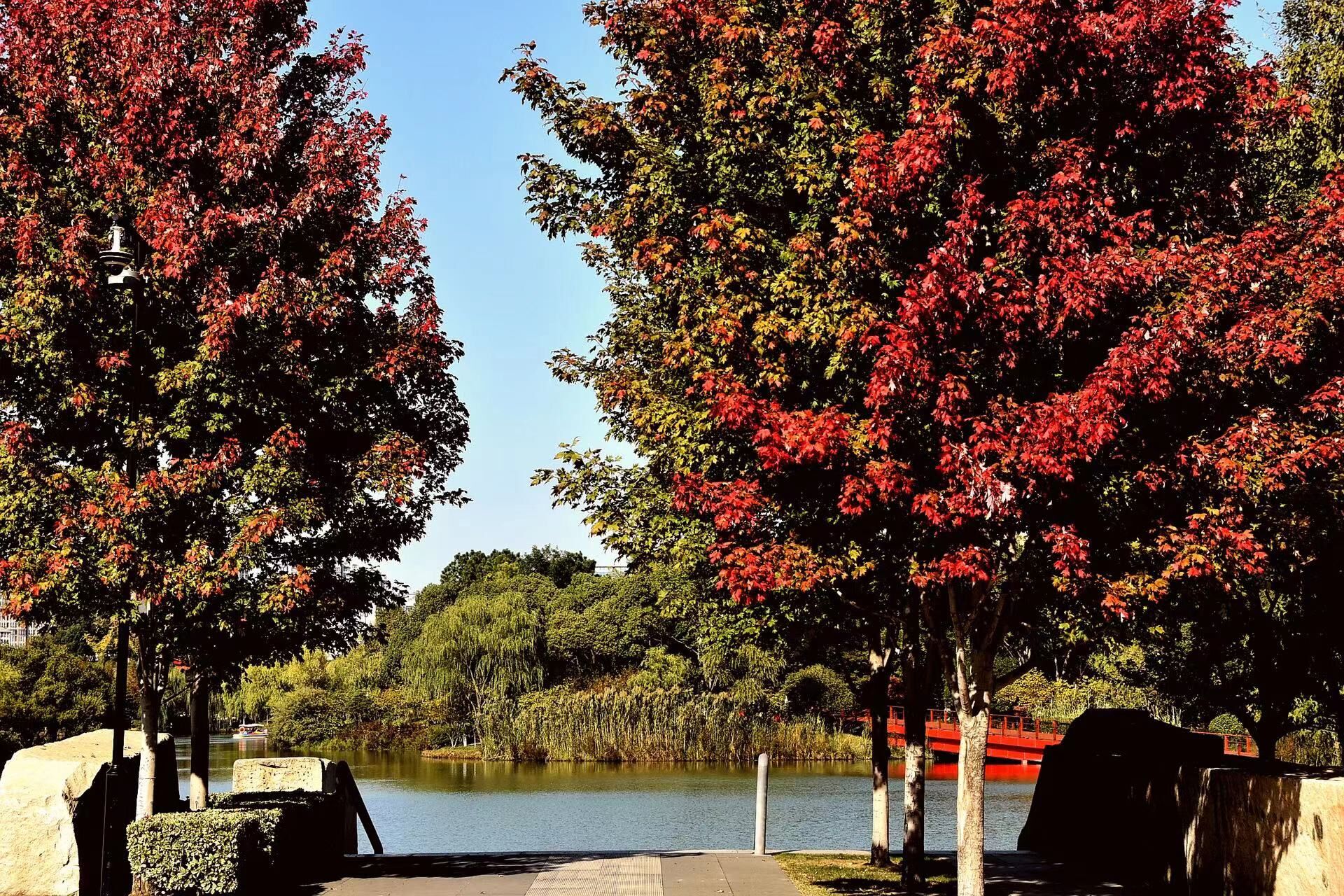 霜落千林木叶丹,远山如在有无间,经秋何事亦孱颜。这是清代王国维观赏了秋叶之美后发出的感叹。而城西的青枫公园有75种丰富的色叶树种,是常州规模最大的色叶树公园。一到深秋,园内色叶树种逐渐变色,与常绿树种一起映衬着蓝天白云,呈现出层林尽染、色彩斑斓的秋季景观。色叶树具有城市季相变化的特质,在生长季节,它们默默地成为绿色背景中的一员;到了秋季,在和煦的阳光沐浴下,它们豁然抖开绚烂的调色板,将金色、橙红、嫩黄、琥珀色、红色和酱紫色交织的油画、水粉画面骄傲地展示,令人感到“似烧非烟火,如花不待春”。