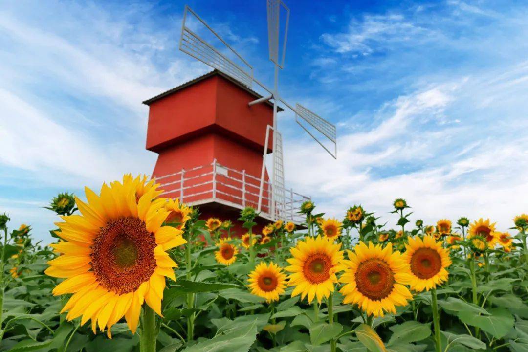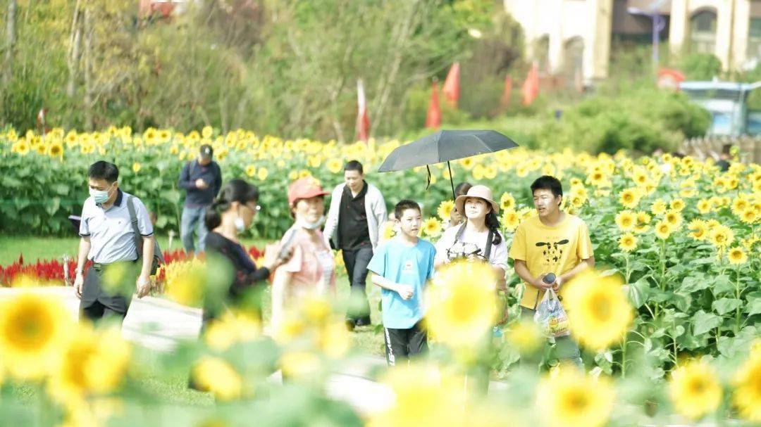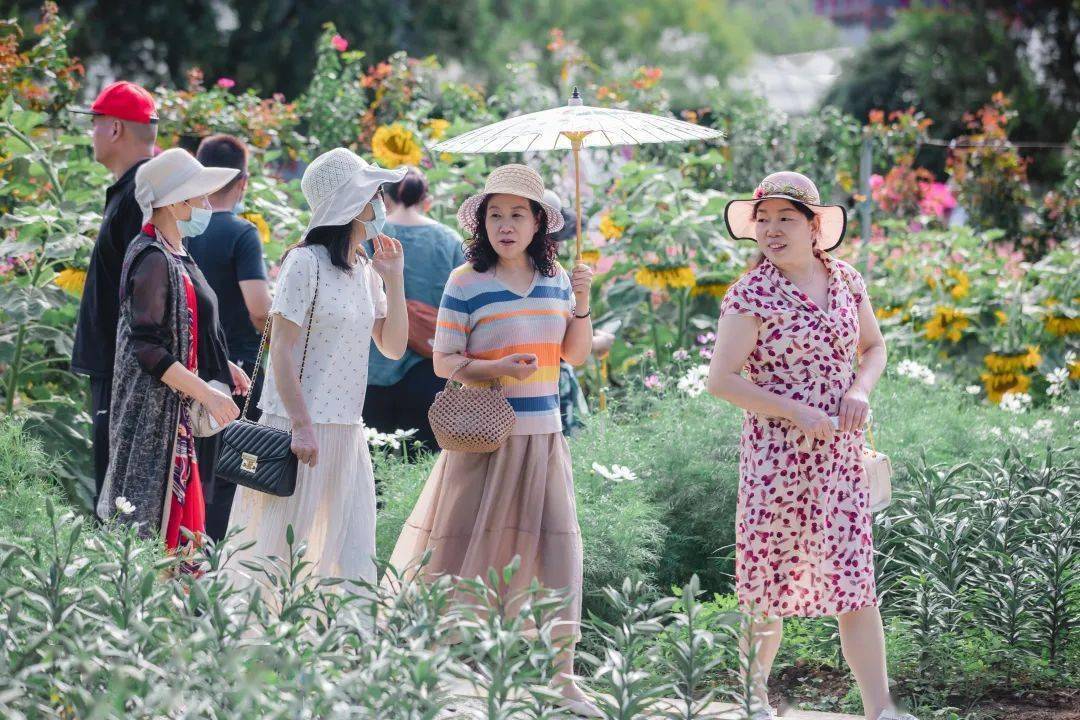 百万花海景区内,粉黛乱子草、向日葵、千日红、醉蝶花、万寿菊……多的是你我叫不出名字的珍贵品种,在微风中向你招手示意,并送上好闻的花香气息。