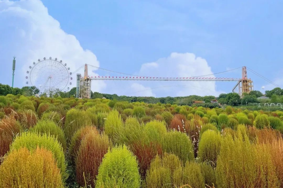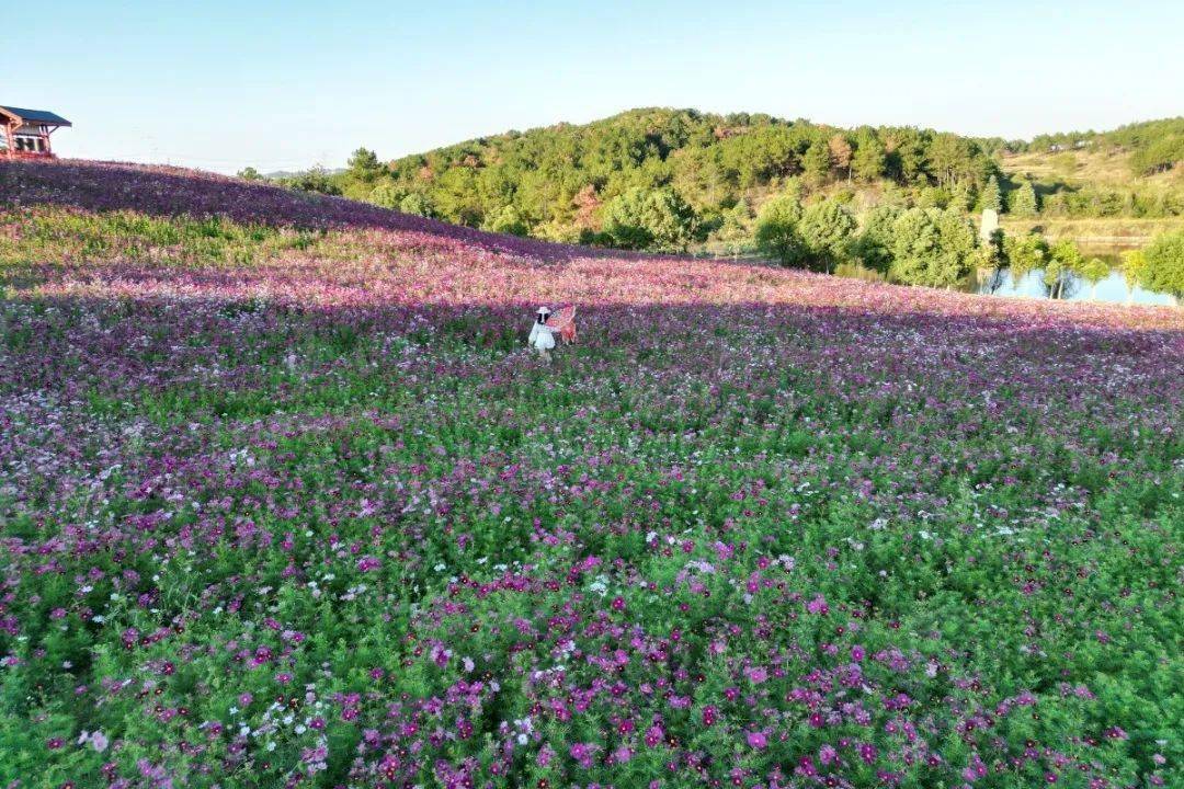 在花海的主干道上悠闲地散步,亦或是乘坐景区观光车沿着群山绕行,犹如身在田园诗画般的梦境里。花海悬崖边的玻璃廊桥,是一道独特的靓丽风景,也是秋日登高望远、拍最美夕阳的最佳打卡地。