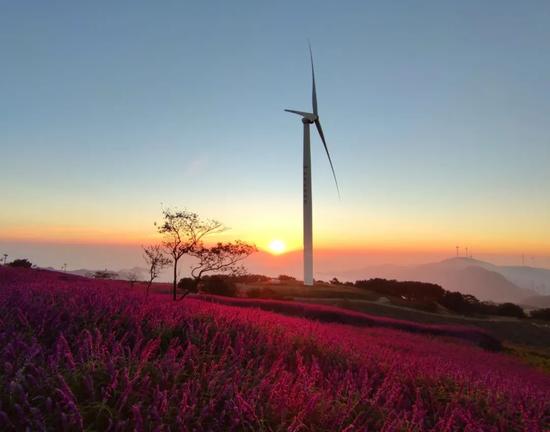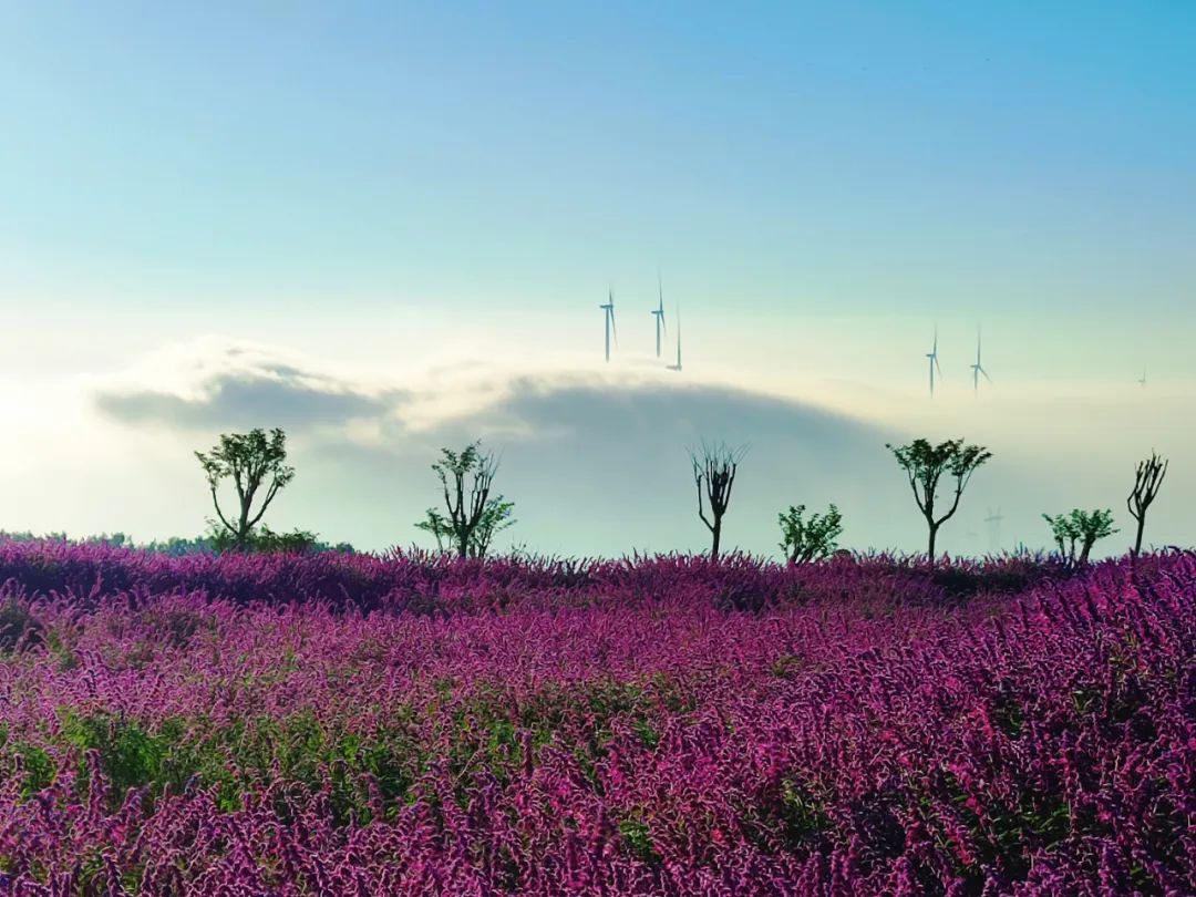 蓝天白云下,120亩紫色鼠尾草花开正艳,漫山遍野的花朵随风摇曳,紫色的花海与远处天然的草坪、风车浑然一体,蝴蝶、蜜蜂在花间飞舞,俨然一派迷人的田园风光。