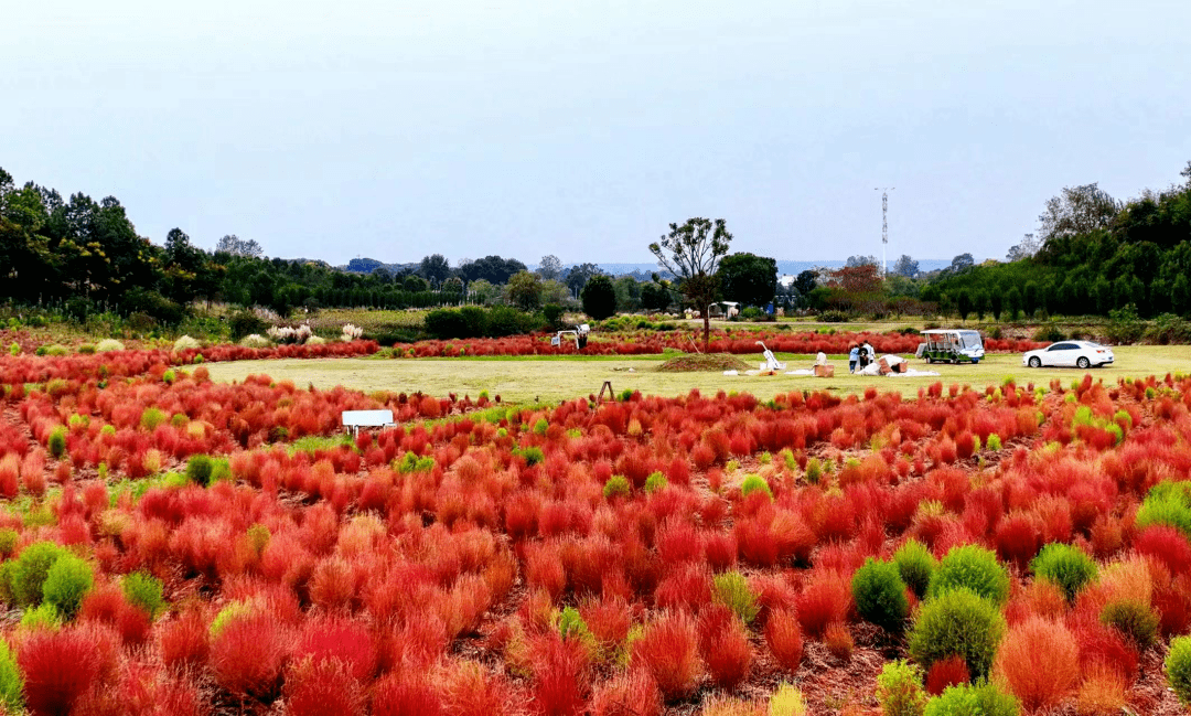 这里的地肤是武汉市当前种植规模最大的一片,目前已进入最佳观赏期,其红色效果最长可持续一个季度。