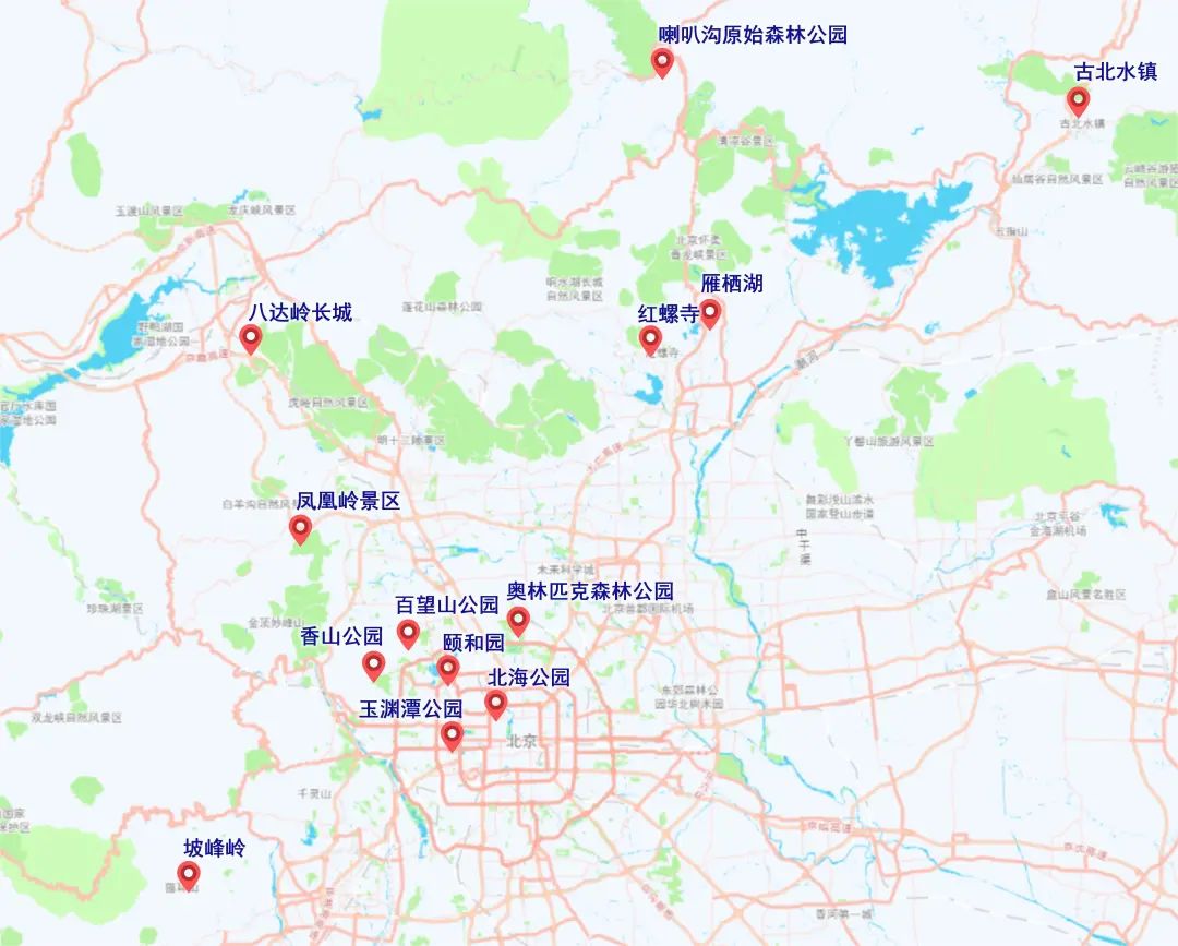 郊区热门打卡景区包括坡峰岭、凤凰岭、喇叭沟门、红螺寺、雁栖湖、八达岭、古北水镇等,去往上述景区的京承高速、京藏高速、京新高速,京港澳高速以及普通公路G111京加线、京周路、范崎路等局部路段可能出现短时交通压力集中情况。