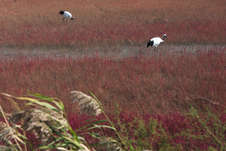 在位于盘锦的辽河三角洲湿地,特殊环境孕育出的碱蓬草铺满滩涂,一到秋天这里就成了“红色海岸线” 新华社记者王乙杰摄