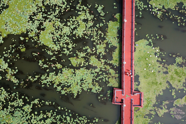 济宁市微山湖旅游区荷园景色。微山湖旅游区内有微山湖国家湿地公园等 新华社记者徐速绘摄