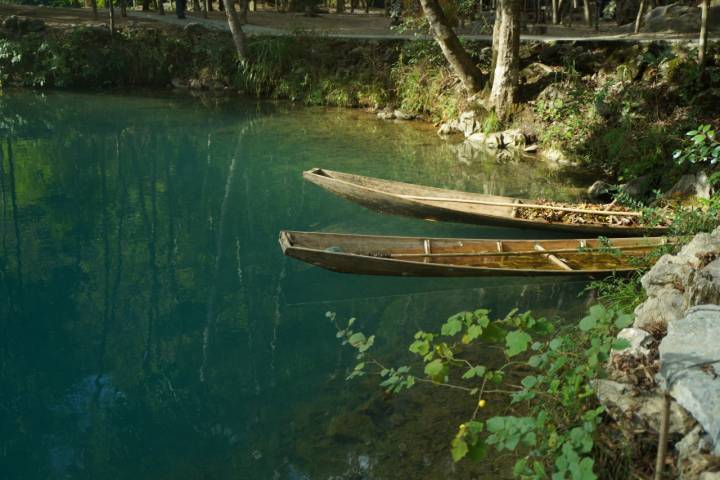 鸳鸯湖是小七孔一奇景,湖水如油,碧绿而凝重。因湖中有两棵并排参天的大树而得名,这两棵大树半截在水中,枝叶则在上方交握,雌树纤巧秀丽,雄树则两三人才能环抱过来,雄壮挺拔。湖面幽静,水道四通八达,不小心还会迷路,不过湖中经常会有领路的船只行走,一旦迷路只需静静等待救援即可。湖的四周由各种颜色的植物组成,严严实实地包了好几层,在湖中荡舟有一种与世隔绝的感觉。绿色当中还掺杂着红色、粉色的花朵,在阳光下美丽而温暖。