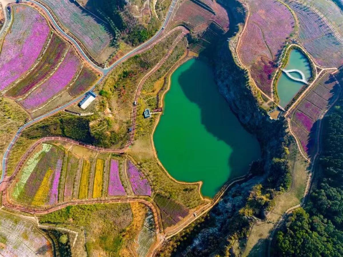 灵山花境位于江夏区,由废弃矿山改造而来,这里隐约可见开采的痕迹,幽绿潭水犹如翡翠一样镶嵌在那里。将时间拨到十年前,灵山大大小小采石场30余家。白天放炮开山,晚上机器轰鸣,灵山成了“灰山”。矿山复绿,是人们对绿色美好生活的向往,是当地人对自由、自然、健康的文化追求。