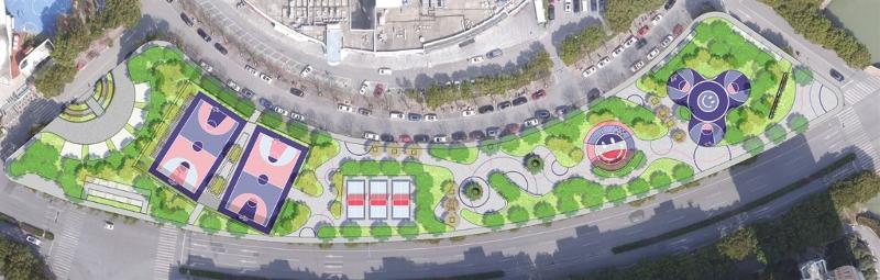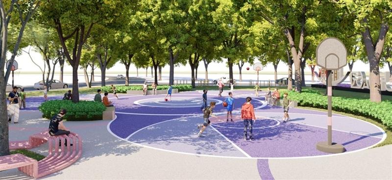 公园的主要提升内容包括:强化主入口形象,提升绿化,增加标志性LOGO墙体;更新场地,打造篮球、羽毛球、儿童活动等运动场地。