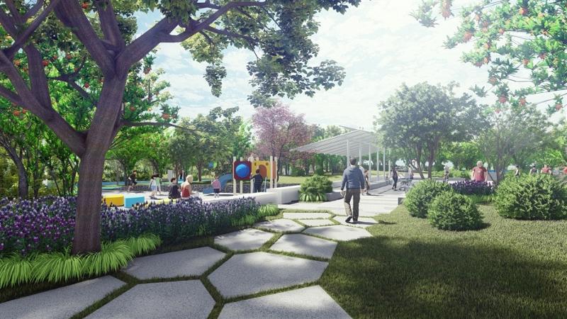 公园的主要提升内容包括:铺装更新,新建硬质树池、景观廊架、儿童活动场地;移除原有的长势较差的灌木,补种新苗;标识标牌及活动设施更新。