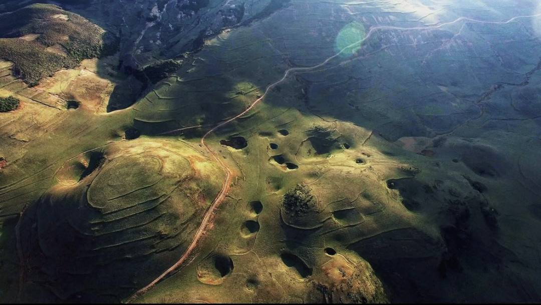 龙头山大断崖下,一个个圆坑散落排列,宛如外星世界。杨勇摄